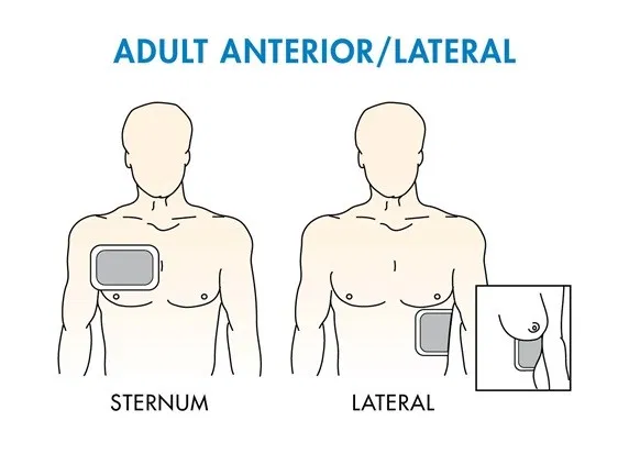 Attach the pads; Follow the diagrams on the pads or machine; Place one pad on the upper-right chest and the other on the lower-left side (below the armpit)